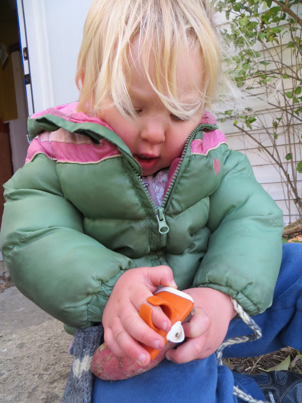taking it into the yard so everyone can help pull off the tubers
